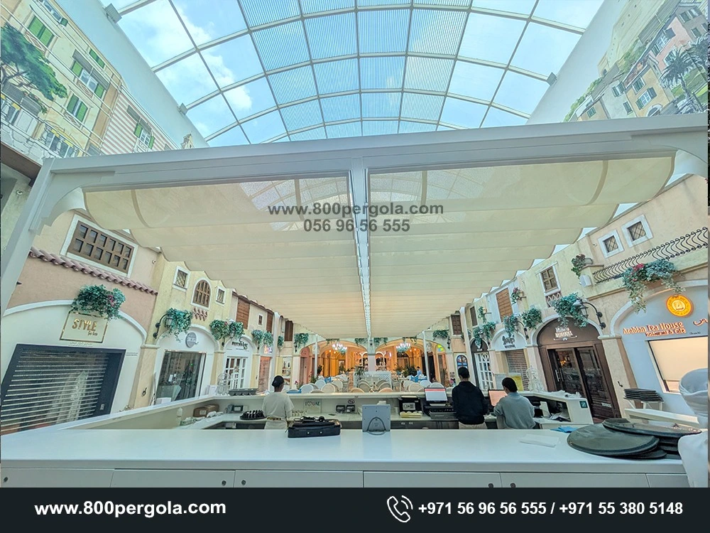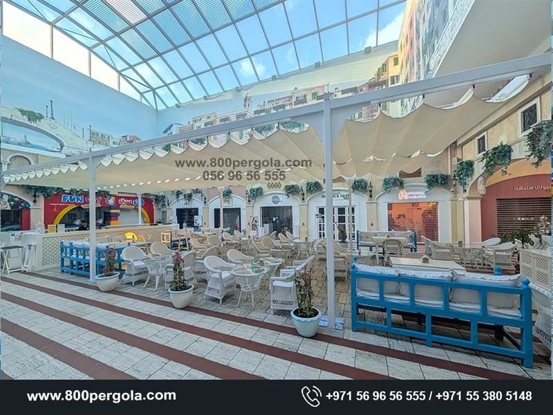 Get a glimpse of our recently completed Motorized Wave fabric system at Mercato Mall. We are a one-stop Pergola development company for all your Wooden & Aluminium Pergola needed work in Dubai.